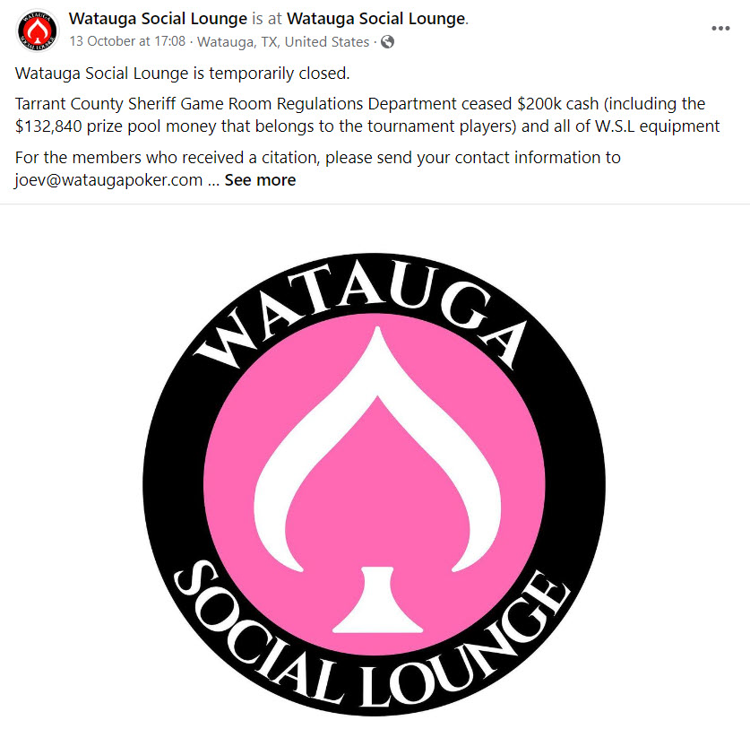 The club, which only opened in January of this year with the Mayor of Watauga in attendance for the ribbon-cutting ceremony, added: “We sincerely apologize for any inconvenience this has caused to our members, to our staff, to the poker community and to the city of Watauga. Thank You for the love and support we have been given. We hope to open back up soon.”