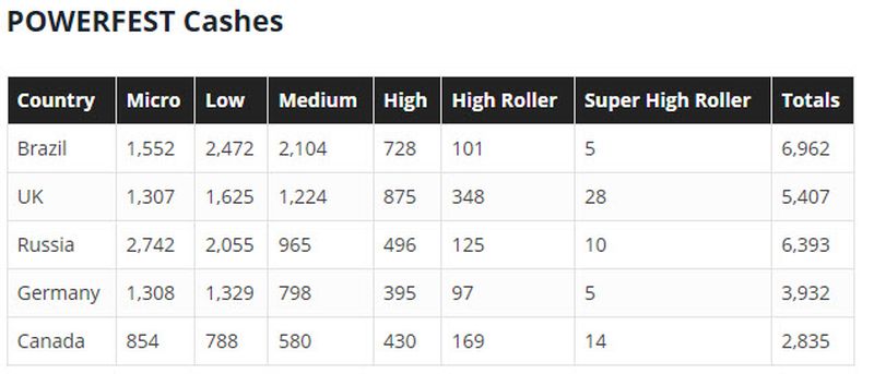 Interestingly, the 40 wins have been by 40 different players, and the total crosses three POWERFEST buy-in levels almost equally – Low events (12 wins), Medium events (9) and Micro events (11) – and four apiece at the higher stakes – resulting in a total of $393,276.39 heading to Brazilian shores.