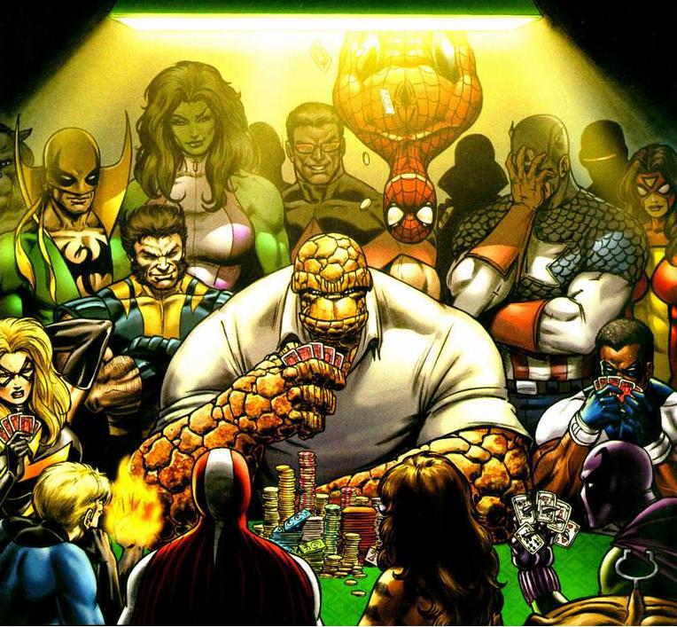 Poker has also been intertwined in the story of Thing, aka Ben Grimm. A 2006 series about Thing was wrapped up with one large poker game among staple Marvel superheroes like Spider-Man, Captain America, Iron Man, Dr. Strange and many others. He even thinks about the poker games he’s had with a fallen comrade to reminisce.