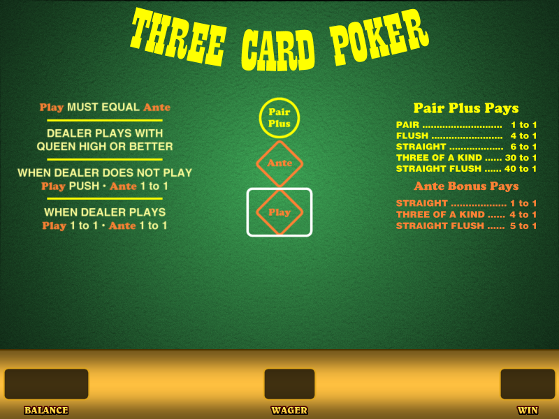 Assuming the dealer does have a Queen or higher the round proceeds with hands ranked in the following order: Straight Flush, Three of a Kind, Straight, Flush, Pair, High Card. Players beating the dealer’s hand are paid an evens win as well as an Ante bonuses for certain hands like a Royal Flush Three of a Kind and even a Straight. These may differ from online casino to casino so it’s worth checking before you play