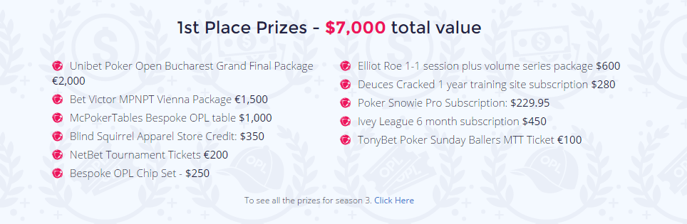 Everything the OPL sponsors have added is designed to improve or enhance your poker – tournament packages, flights to events, tickets to enter them, coaching for when you get there as well as beautiful bespoke poker tables and chip sets for honing your game with friends at home.
