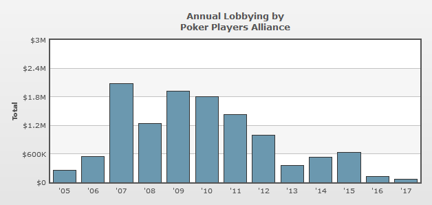 Founded in 2005 with a mission that focuses on lobbying efforts to establish a secure and regulated environment for U.S. poker players, the Poker Players Alliance (PPA) is on pace to spend roughly $120,000 on lobbying expenditures this year, which would be the lowest amount in its 13-year history.