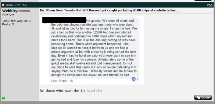 The statement follows several days of speculation and rumour about Kassouf’s behaviour on a drunken night during the GUKPT stop in Leeds, England – claims that he ‘stole chips from a friend at the roulette table’ emanating from sources close to the Rickmansworth player and spreading virally online among the poker community after Shaun Deeb tweeted the allegations.